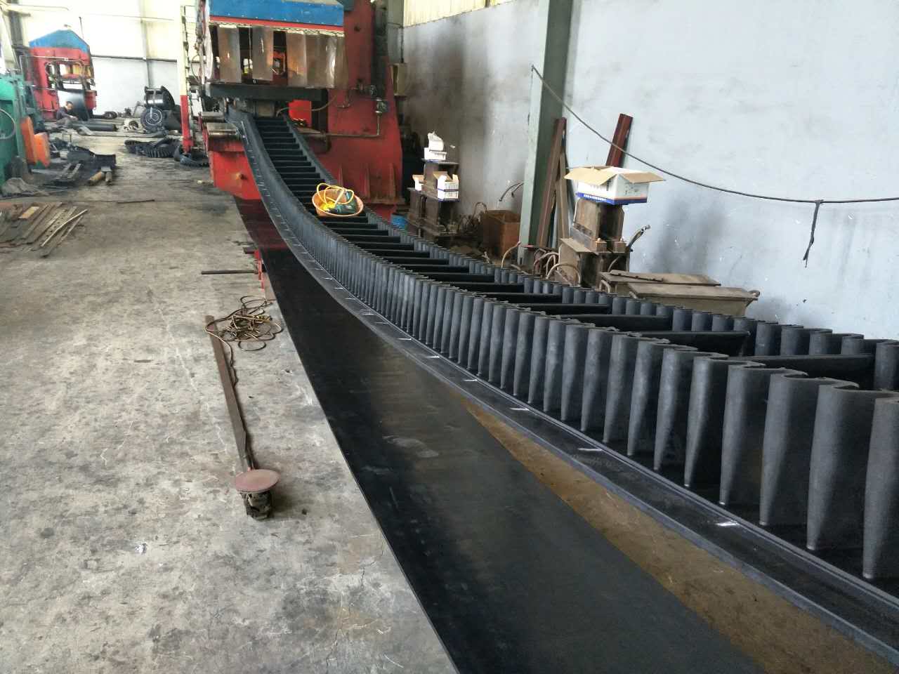 輸送帶質量(kg)={布層數x每層質量(kg/㎡)+〖上膠厚度(mm)+下膠厚度(mm)〗x沒毫米厚膠料質量(kg/㎡)}x帶寬(m)x帶長(m)